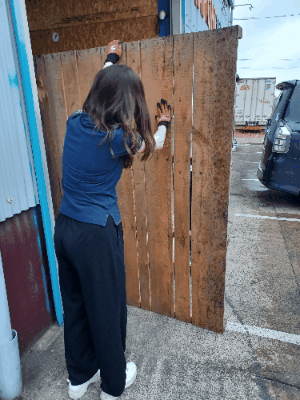 プランターには、廃材にする予定だったパレットを使い、手作りしました。弊社で使用しているパレットは、一斗缶がちょうど20缶置けるサイズで、その総重量は400kg以上になることもあります。そのため木でできているパレットはとても固く、交代しながらパーツを切り出し、組み立てを行いました。