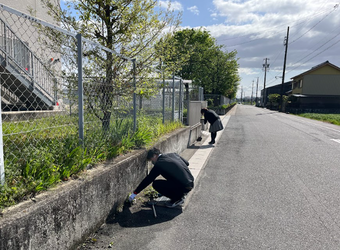 通学路と思われる弊社付近の歩道には雑草が生え、歩道も狭く、縁石のない歩道も多いです。子ども達の使用する通学路は、私たちの車の通勤路でもあり、配送トラックも一日中走っています。その通学路が綺麗で、雑草も少ない道であれば子ども達もより安心して通学できるのではないかと思い至りました。入学、新学年で新しい環境の中、登園、登校している子どもたちのために、私たちができることは何かを考え、まずは社内で行っている清掃を学校、保育園周りから始めることにしました。